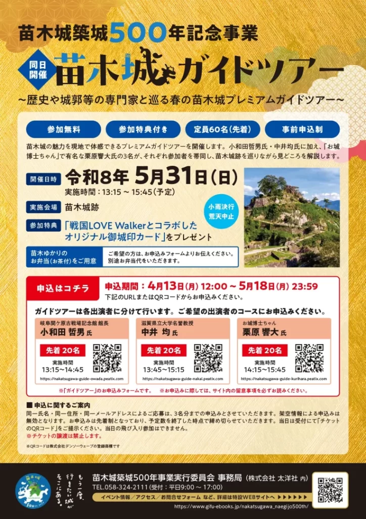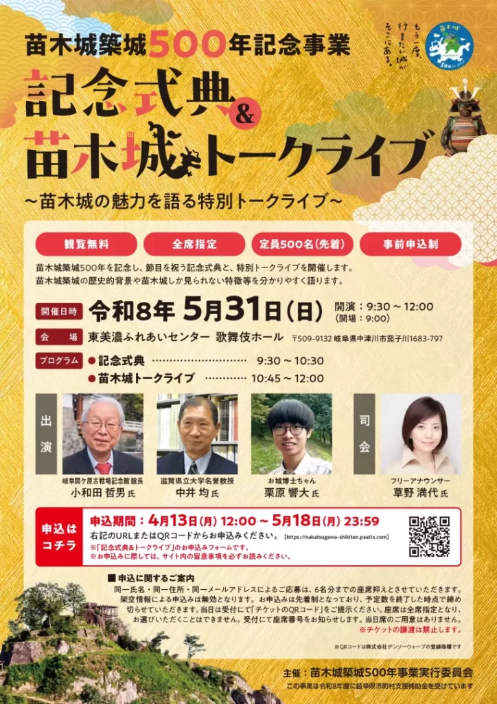 苗木城築城500年を記念し、節目を祝う記念式典と、特別トークライブを開催します。
