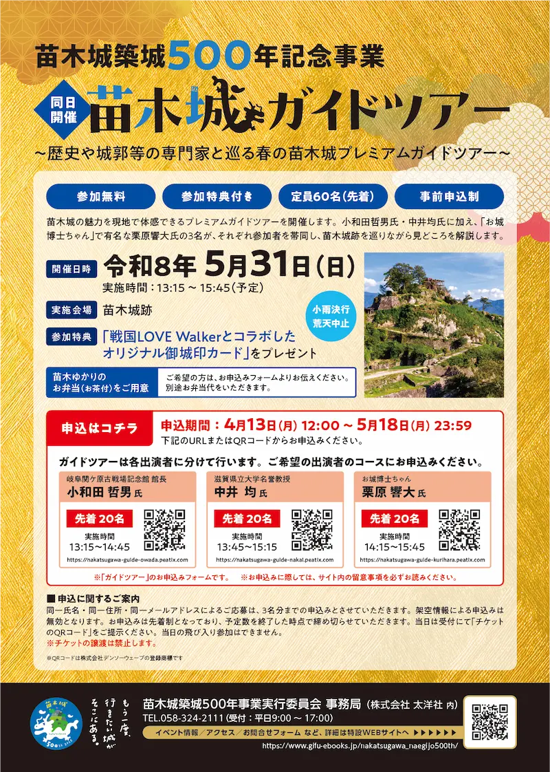 苗木城ガイドツアー 小雨決行荒天中止 ~歴史や城郭等の専門家と巡る春の苗木城プレミアムガイドツアー~ 参加無料 参加特典付き 定員60名(先着) 事前申込制 苗木城の魅力を現地で体感できるプレミアムガイドツアーを開催します。小和田哲男氏・中井均氏に加え、「お城博士ちゃん」で有名な栗原響大氏の3名が、それぞれ参加者を帯同し、苗木城跡を巡りながら見どころを解説します。 開催日時 令和8年5月31日(日) 【実施時間】13:15~15:45(予定) 実施会場 苗木城跡 参加特典 「戦国LOVE Walkerとコラボしたオリジナル御城印カード」をプレゼント 苗木ゆかりのお弁当(お茶付)をご用意 ご希望の方は、お申込みフォームよりお伝えください。別途お弁当代をいただきます。 「苗木城ガイドツアー」お申込み 【申込期間】 4月13日(月) 12:00~ 5月18日(月) 23:59 苗木城ガイドツアーは各出演者に分けて行われます。ご希望の出演者のコースにお申込みください。 岐阜関ケ原古戦場記念館 館長 小和田 哲男 氏 【実施時間】13:15~14:45 お申込みはコチラ お申込みはコチラ 先着20名 滋賀県立大学名誉教授 中井 均 氏 【実施時間】13:45~15:15 お申込みはコチラ お申込みはコチラ 先着20名 お城博士ちゃん 栗原 響大 氏 【実施時間】14:15~15:45 お申込みはコチラ お申込みはコチラ 先着20名 「苗木城ガイドツアー」のお申込みフォームです。 お申込みに際しては、お申込みページ内の留意事項を必ずお読みください。 申込に関するご案内 同一氏名・同一住所・同一メールアドレスによるご応募は、3名分までのお申込みとさせていただきます。架空情報によるお申込みは無効となります。お申込みは先着制となっており、予定数を終了した時点で締め切らせていただきます。当日は受付にて「チケットのQRコード」をご提示ください。当日の飛び入り参加はできません。 チケットの譲渡は禁止します。 ※QRコードは株式会社デンソーウェーブの登録商標です チラシはコチラ