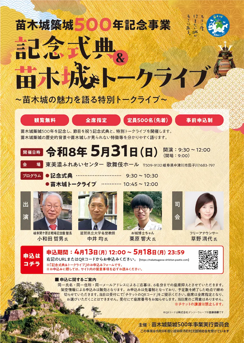 記念式典&苗木城トークライブ ~苗木城の魅力を語る特別トークライブ~ 観覧無料 全席指定 定員500名(先着) 事前申込制 苗木城築城500年を記念し、節目を祝う記念式典と、特別トークライブを開催します。 苗木城築城の歴史的背景や苗木城しか見られない特徴等を分かりやすく語ります。 開催日時 令和8年5月31日(日) 開演:9:30(開場:9:00) 会 場 東美濃ふれあいセンター 歌舞伎ホール 〒509-9132 岐阜県中津川市茄子川1683-797 プログラム 記念式典 9:30~10:30 苗木城トークライブ 10:45~12:00 出 演 岐阜関ケ原古戦場記念館 館長 小和田 哲男 氏 滋賀県立大学名誉教授 中井 均 氏 お城博士ちゃん 栗原 響大 氏 司 会 フリーアナウンサー 草野 満代 氏 先着500名 「記念式典&苗木城トークライブ」お申込み 【申込期間】 4月13日(月) 12:00~ 5月18日(月) 23:59 お申込みはコチラ 「記念式典&苗木城トークライブ」のお申込みフォームです。 お申込みに際しては、お申込みページ内の留意事項を必ずお読みください。 申込に関するご案内 同一氏名・同一住所・同一メールアドレスによるご応募は、6名分までの座席押さえとさせていただきます。架空情報によるお申込みは無効となります。お申込みは先着制となっており、予定数を終了した時点で締め切らせていただきます。当日は受付にて「チケットのQRコード」をご提示ください。座席は全席指定となり、お選びいただくことはできません。受付にて座席番号をお知らせします。当日席のご用意はありません。 チケットの譲渡は禁止します。 ※QRコードは株式会社デンソーウェーブの登録商標です チラシはコチラ