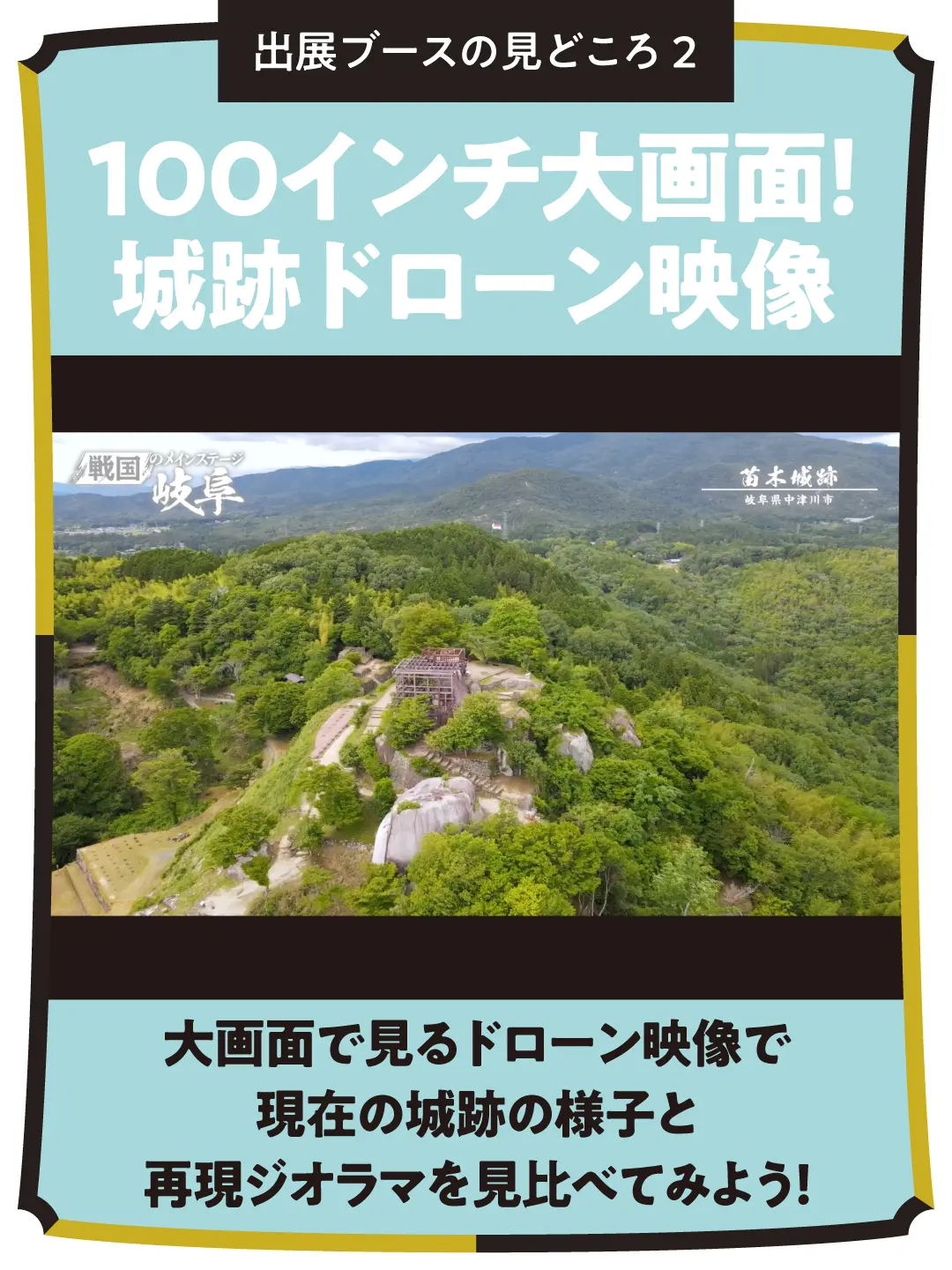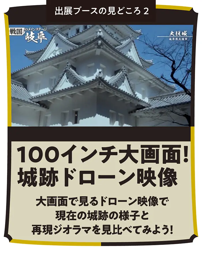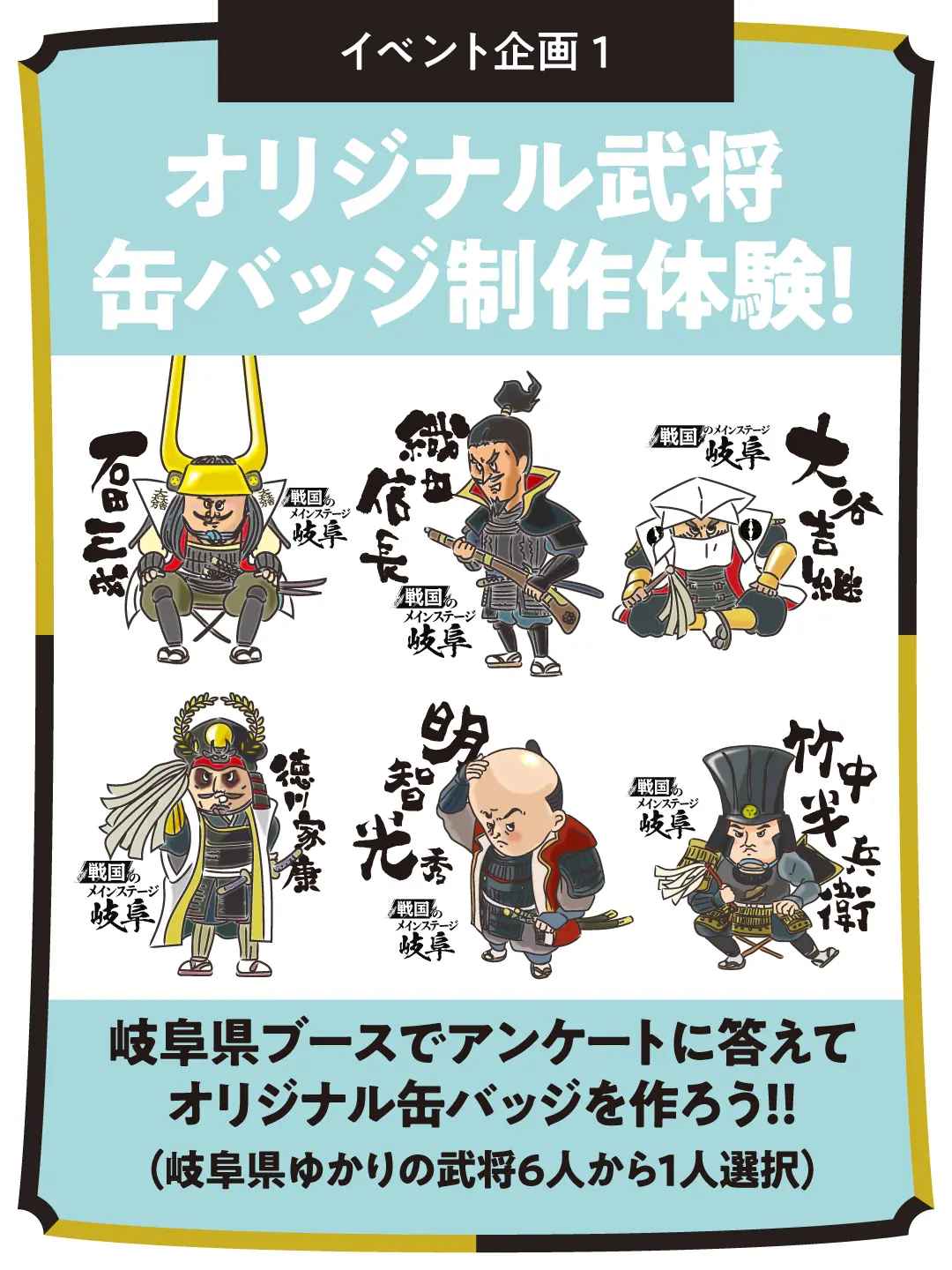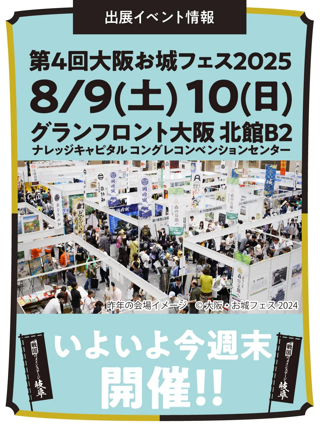 岐阜県は、斎藤道三が下剋上を体現した地、織田信長が天下布武を掲げた地、そして、徳川家康が関ケ原の戦いで戦国を終結させた地であり、今でも数多くの史跡や歴史的建造物が残る「戦国のメインステージ」です。 今年もお城イベントに出展し、史跡からゆかりの戦国武将や文化まで、幅広くPRしていきます。