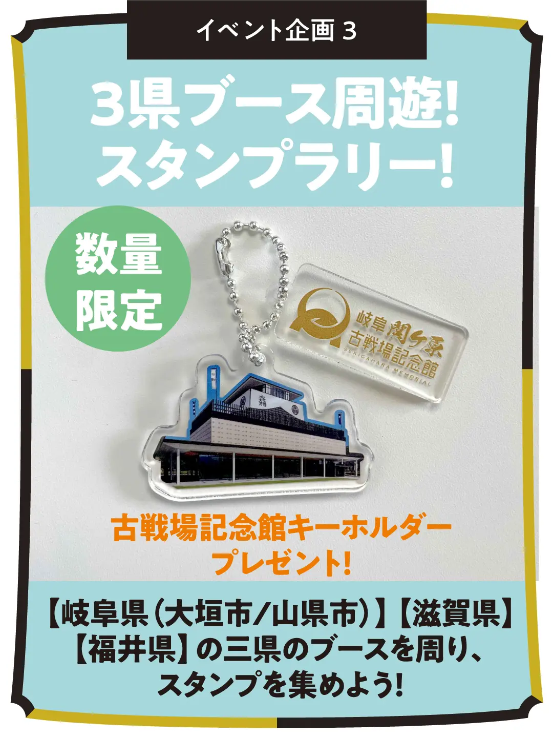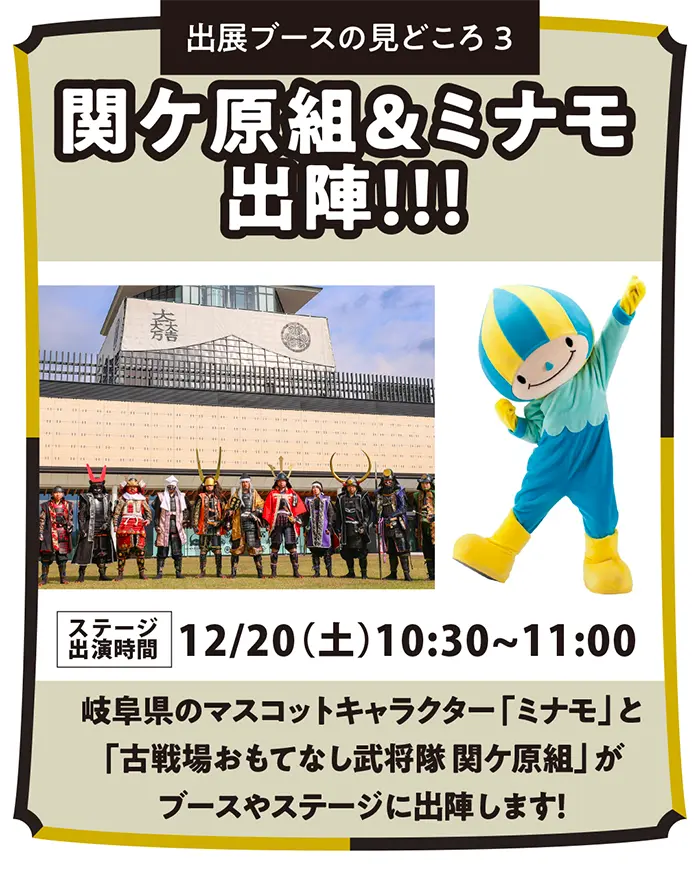 ブースでは展示だけでなく、関連自治体ブースを巡るスタンプラリーをはじめとした、会場限定の体験企画も用意しています。参加いただいた方には、お城や武将のオリジナルグッズをプレゼントします。 イベントステージには、「古戦場おもてなし武将隊 関ケ原組」、岐阜県のマスコットキャラクター「ミナモ」が登場します。 詳しくは岐阜県「戦国のメインステージ岐阜」公式SNSでもお知らせしています。